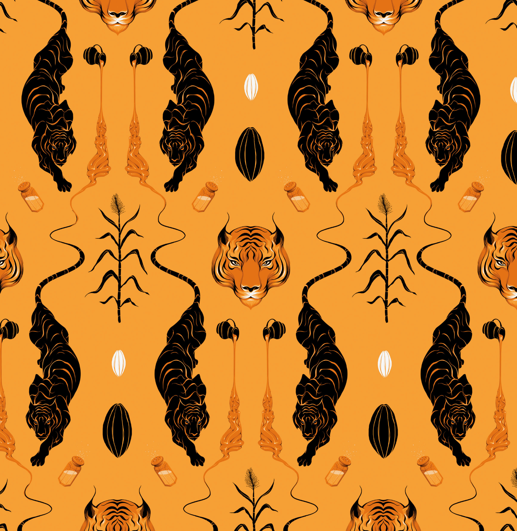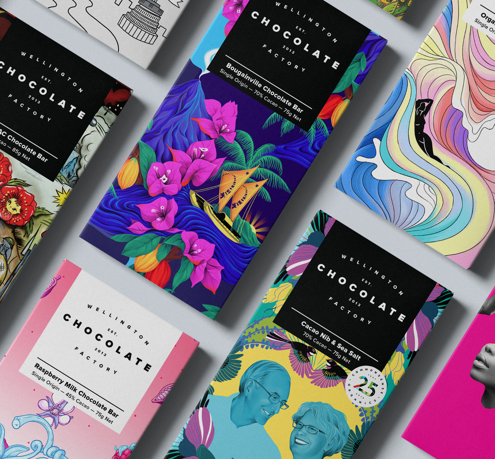 Gina was the first artist we commissioned for a WCF wrapper, and this bar is a true original. Still our most popular flavour, this salted caramel brittle artwork was inspired by the alluring; featuring our now iconic tiger, liquid caramel, sugar cane and of course, the cacao pod.