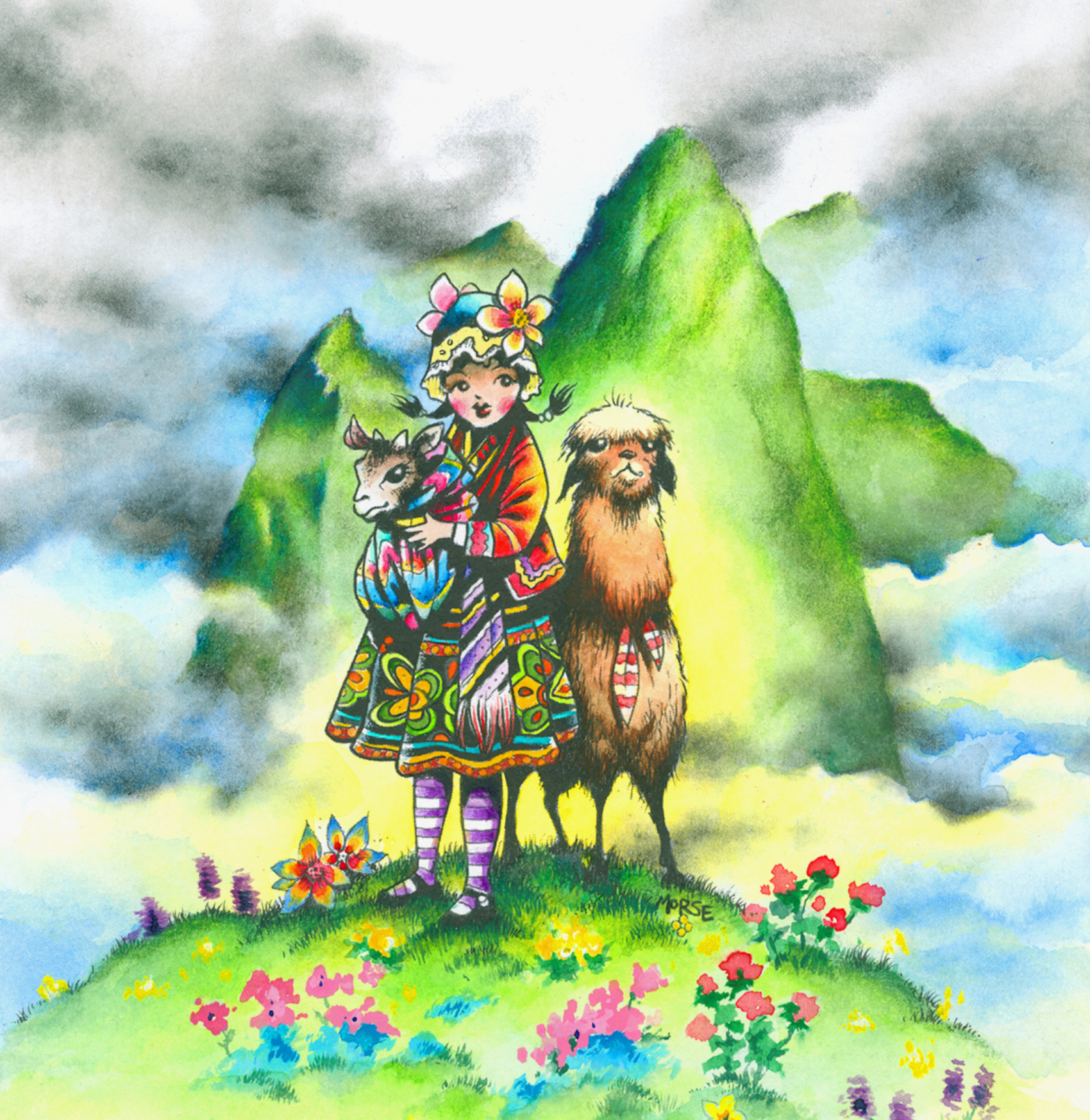 As well as owning the Dr Morse Tattoo Studio, Simon is a children’s book illustrator. This illustration was inspired by a photo our co-founder, Gabe, took on a cacao sourcing mission in the mountains of Peru, with Machu Picchu featuring prominently in the background.
