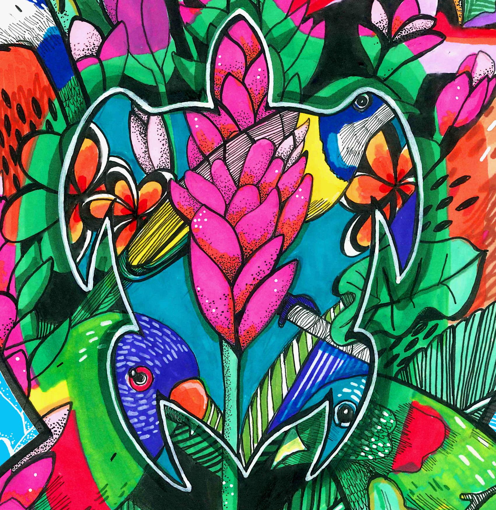 Mica, famous for her traditionally-illustrated work centered around animals, created this beautiful piece. She incorporated native flora, local colours and some of the amazing, unique creatures found in The Solomon Islands.