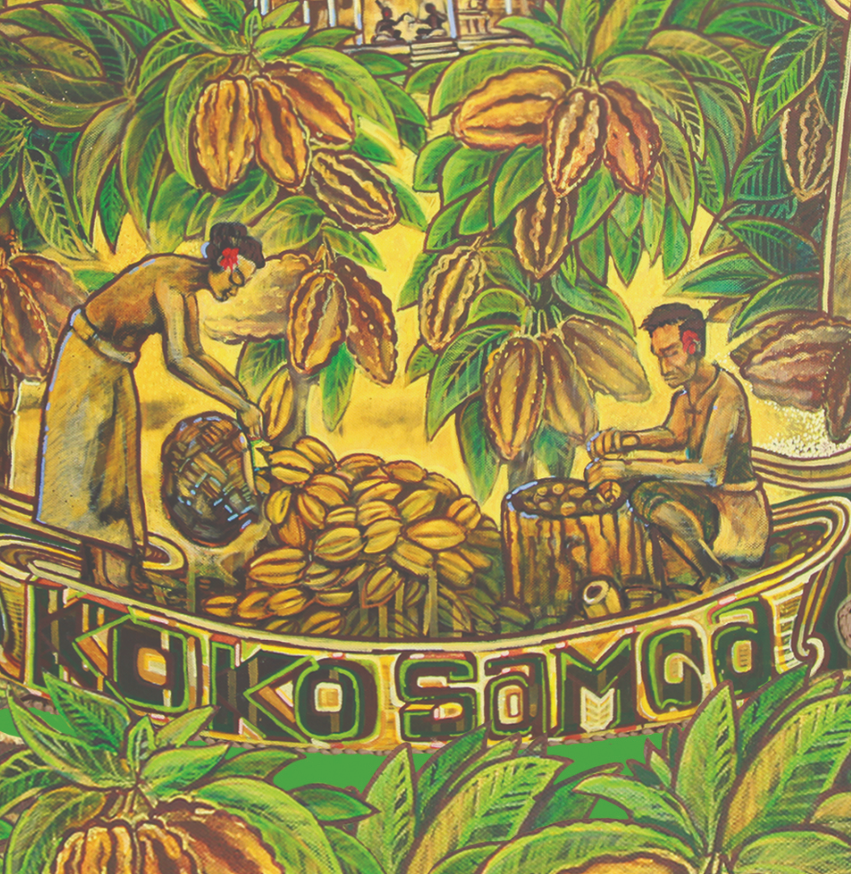 This is the only piece in our collection which wasn’t commissioned. To many, Michel needs no introduction as an established New Zealand/Samoan artist. We are honoured to have this original painting hanging in our factory, depicting the preparation of the traditional cocoa drink Koko Samoa. The brown pigment in this painting was even derived from real cocoa.
